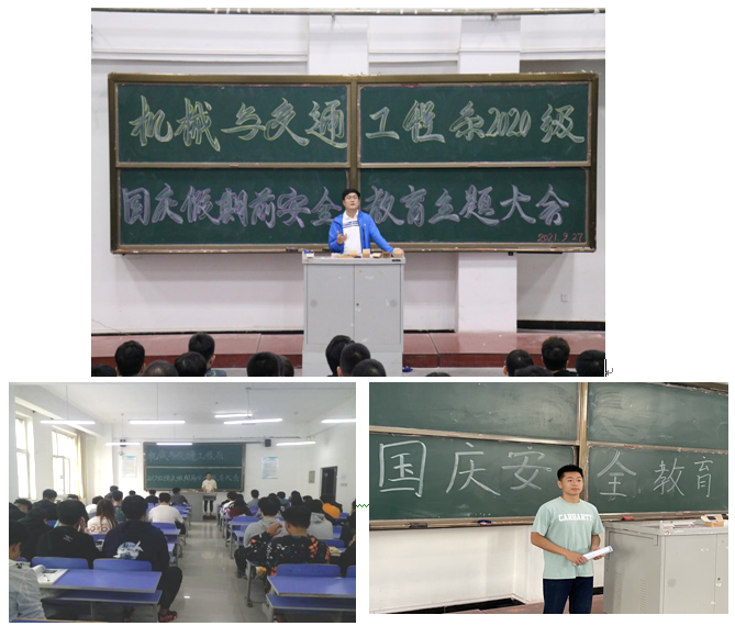 【学团】9月27-29日,机械与交通工程系各年级辅导员分别组织召开国庆假期安全教育主题班会。会上各年级辅导员老师向同学们说明了假期外出审批备案管理的要求和程序,对离校不离沈、离沈不离辽和既离沈又离辽的三类离校学生返校流程进行详细讲解。同时,从当前疫情形势、外出乘车安全、饮食安全、防盗防骗、留校学生的管理、各班级坚持日报告零报告等方面叮嘱同学们国庆假期注意安全。(根据机械与交通工程系供稿修改 通讯员:周思文)
