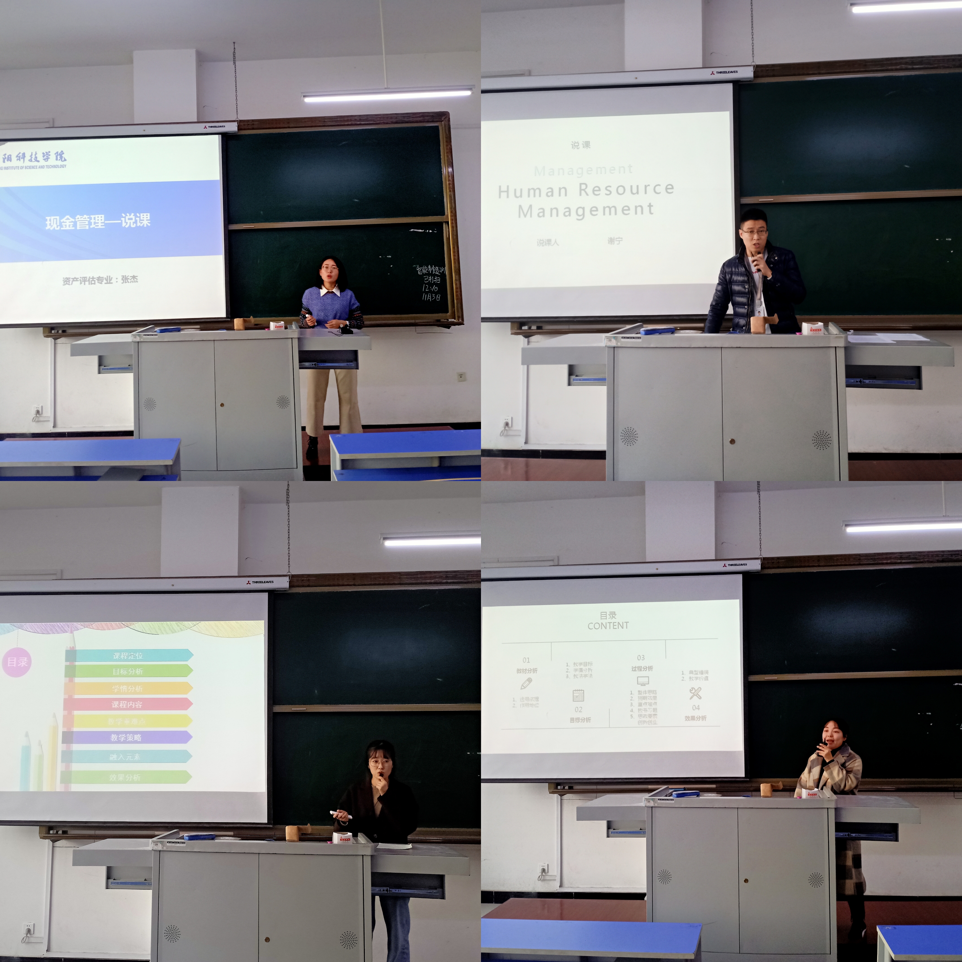 【教学】11月3日,管理系举办了青年教师说课大赛。管理系教学副主任郑鑫、系部督导组成员、各教研室主任观摩了本次比赛。本次比赛,经过教师申报,教研室选拔,最终确定谢宁、张杰、尹慧敏、陈蒙等4位教师同台竞技,共展青年教师风采。本次教师说课竞赛,四位教师精心准备,从教材分析、目标分析、重难点分析、教学方法、教学过程分析、效果分析等方面以PPT演示的方式,对自己所讲课程进行了精彩的演说。比赛现场气氛热烈,青年教师们怀着对教育工作的高度热情参与比赛,每位参赛选手凭借各自优势和特长,在15分钟内,充分展现了扎实的教学功底和热情饱满的教学风采。通过此次说课大赛,提升了管理系青年教师教育教学能力,更新教育理念、创新教学方法、优化教学过程,树立高校青年教师良好形象。(根据管理系供稿修改)