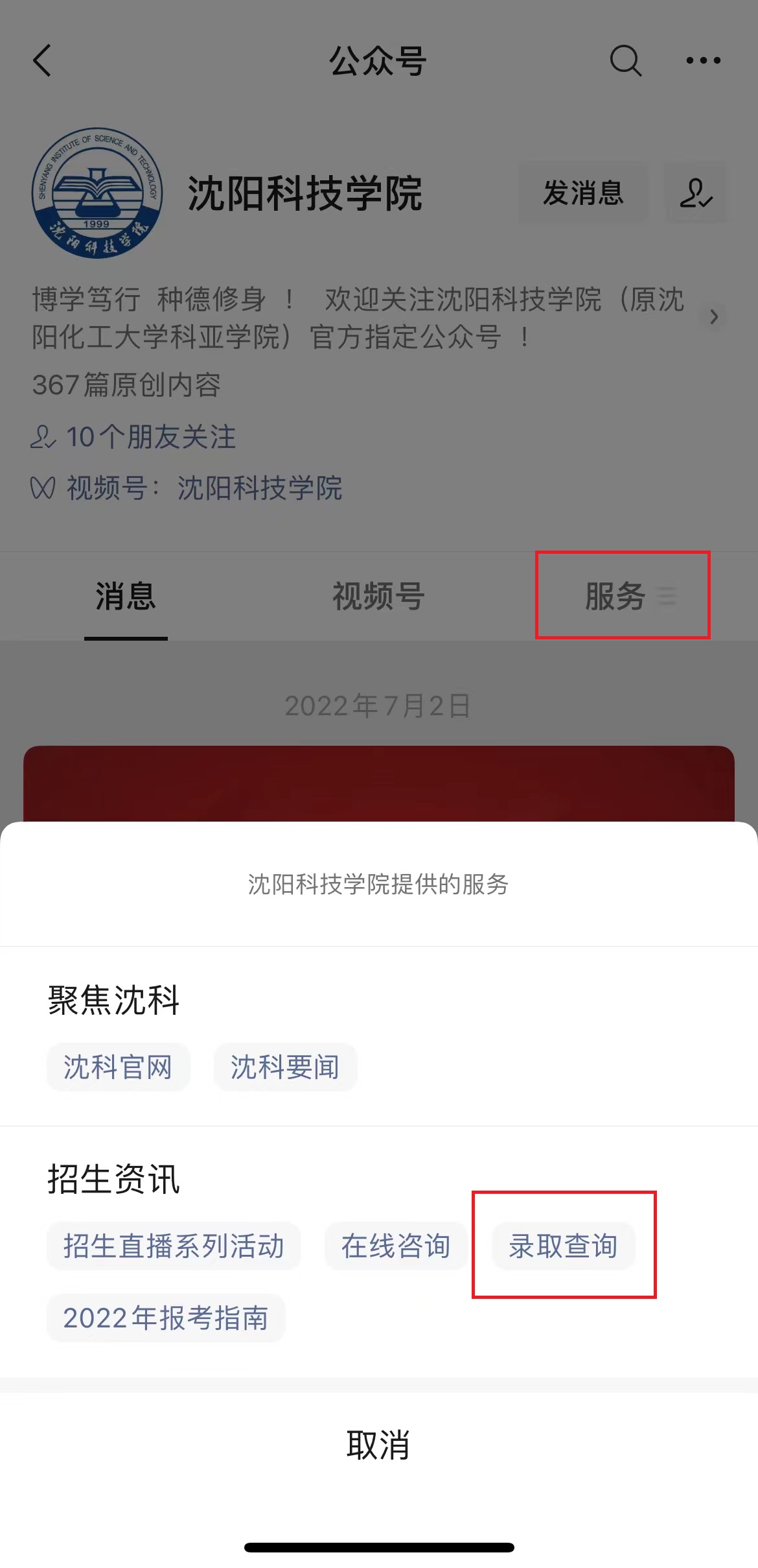 3、校园公众号:考生可搜索beat365官方公众号“beat365亚洲版官网”进入beat365官方微信平台,首页屏幕右下角点击“招生资讯”中的“录取查询”,进入查询页面,通过输入“姓名”和“考生号”即可查询录取结果。