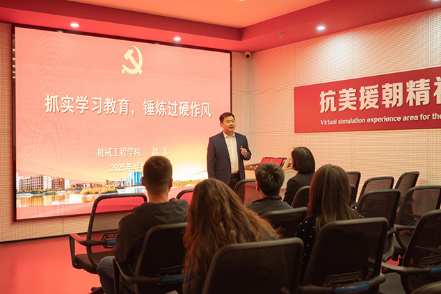 机械工程学院党总支书记赵雷在抗美援朝虚拟仿真体验区处讲授了题为“抓实学习教育,锤炼过硬作风”的主题党课。党课上,赵雷深入剖析了学习教育的重要性,强调了要密切联系群众,改进工作作风,切实解决群众问题以及精简会议活动、厉行勤俭节约等内容,对于在新时代传承发扬志愿军战士们艰苦奋斗、纪律严明的作风,优化党员队伍建设,促进学院发展具有积极意义,引发了在场党员的深刻思考和强烈共鸣。